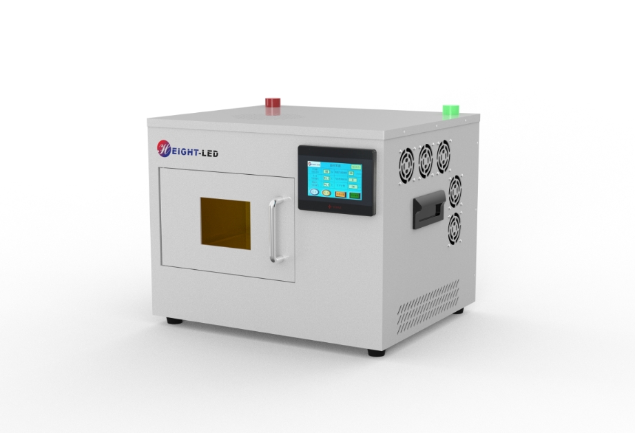 該UV LED旋轉(zhuǎn)烤箱出光位置機(jī)面積為頂部200mmx200mm、背部150mmx100mm,波長(zhǎng)365/385/395/405可選